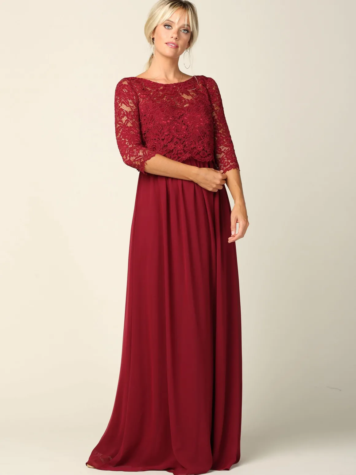 Sød vinrød chiffonkjole med blondeoverdel og ærmer