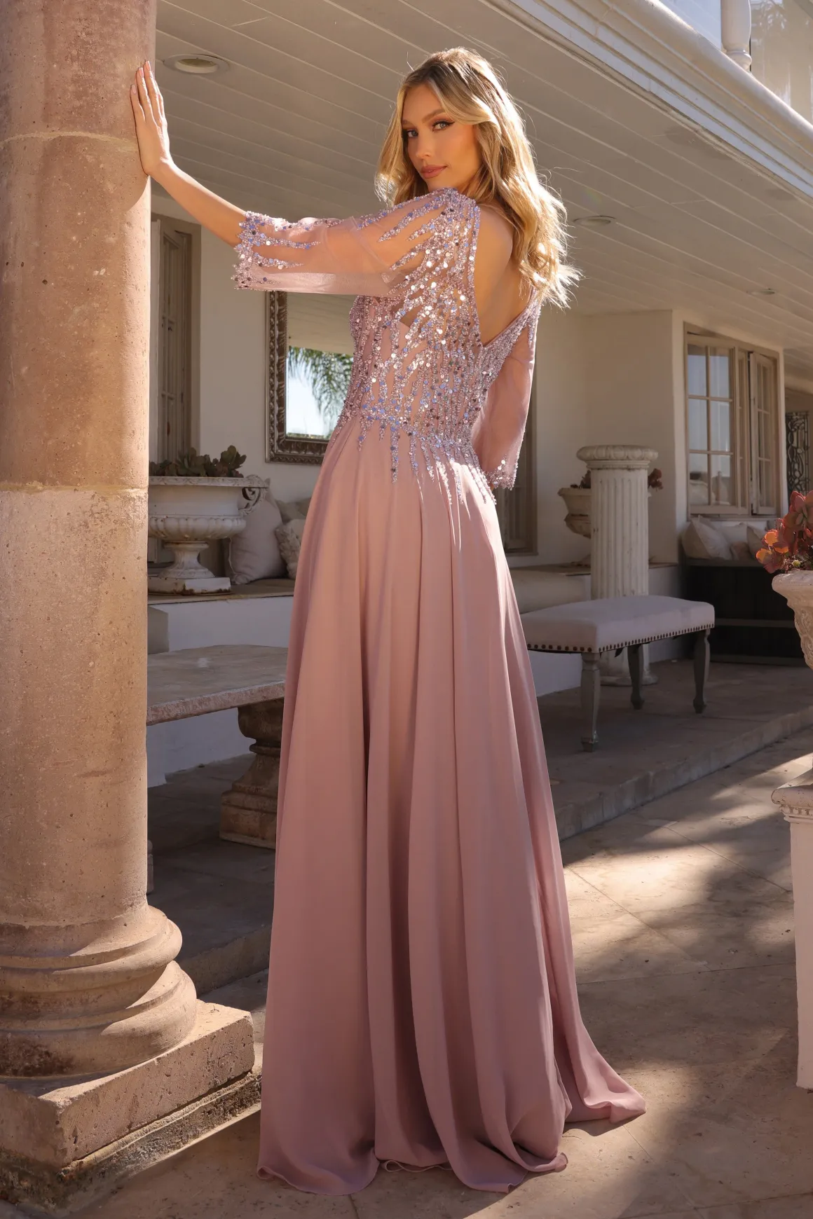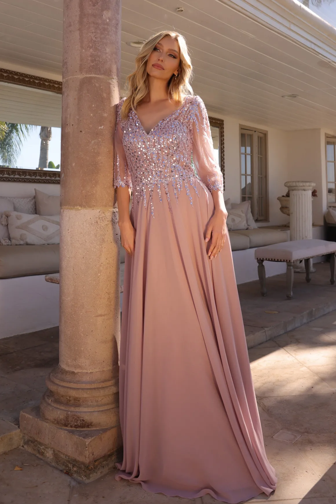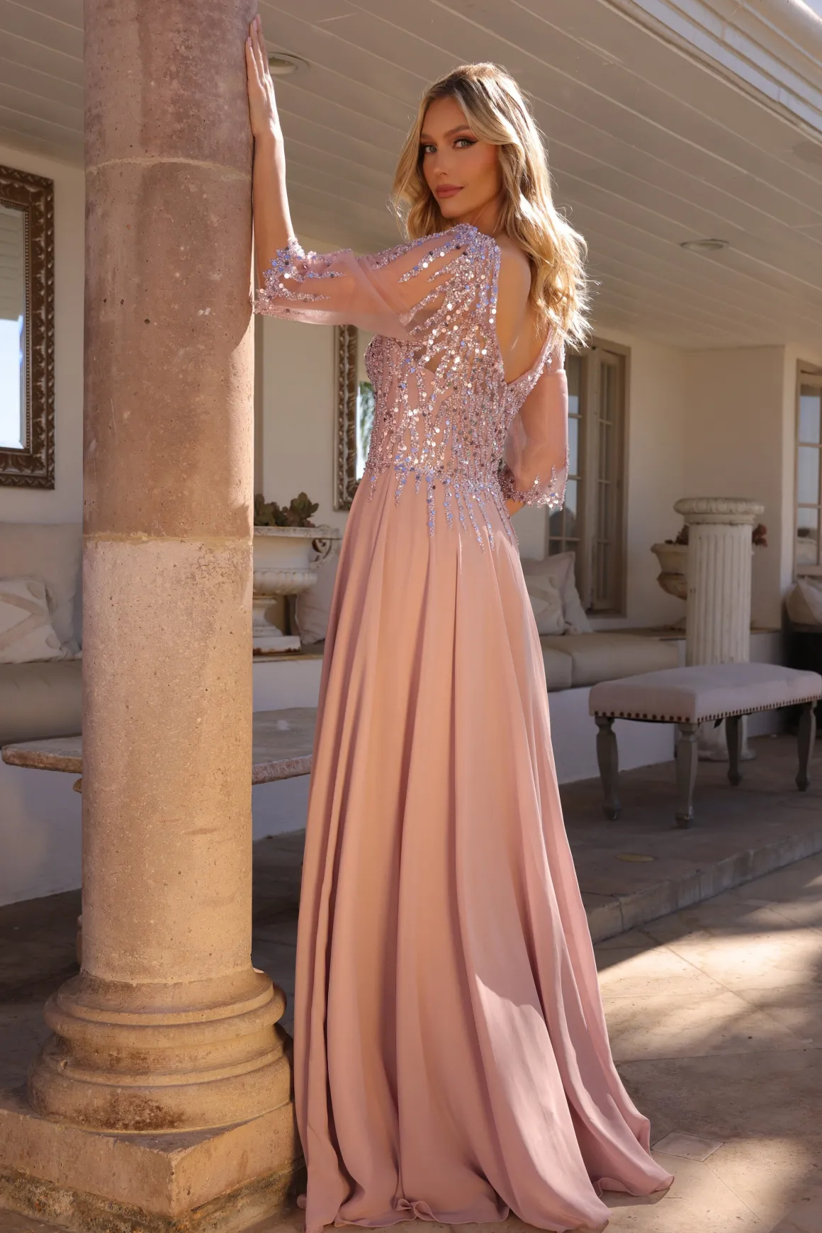 Smuk lang pale pink festkjole med ærmer og pailletter.