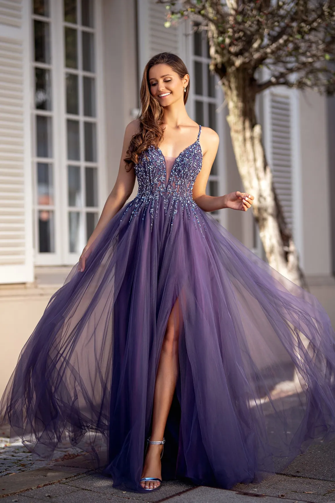 • Christian Koehlert 0682 • Gallakjole i blødt tyl og med mesh udskæring • Masser af sten og høj slids • Kjolen er foret så den kan bruges uden bh • Farve : Lilla • Størrelse 36-42 Smuk lilla tyl gallakjole fra Christian Koehlert med masser af sten og slids. Laves også i rosa Målene er bryst og talje Find din kjol
