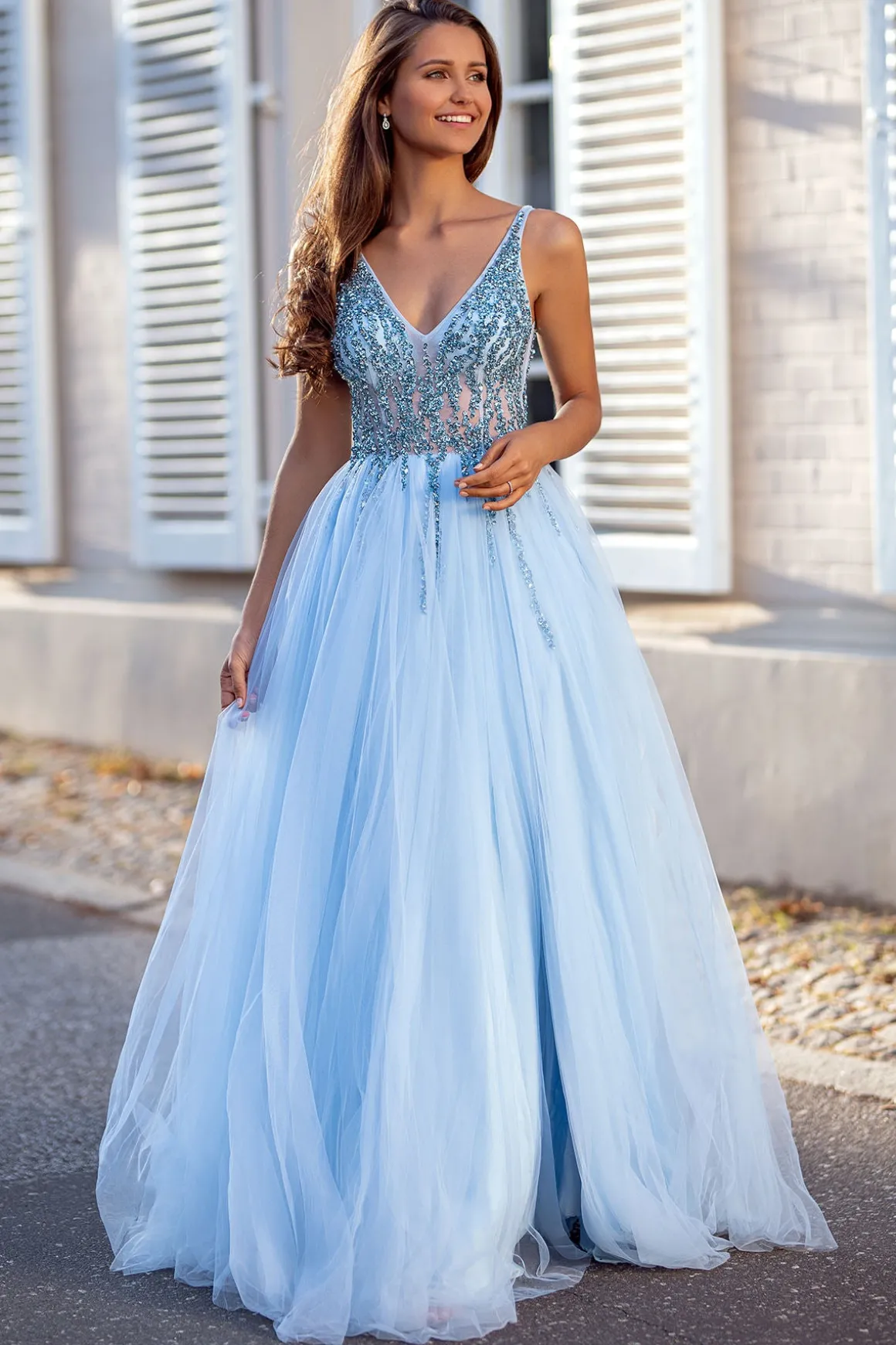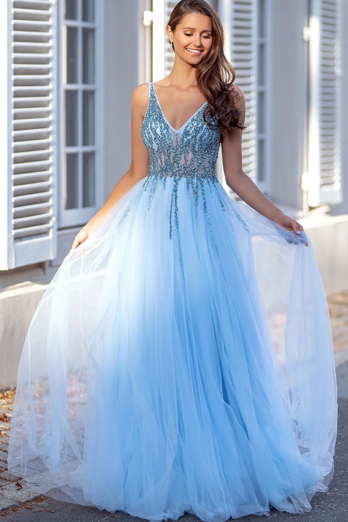 • Christian Koehlert 0265• Gallakjole i blødt tyl med sten• Dyb ryg• Kjolen er foret så den kan bruges uden bh• Farve : Lysblå• Størrelse 32-44 Smuk lysblå tyl gallakjole fra Christian Koehlert med sten og flot dyb ryg Måleskema for Christian Koehlert Paris kjoler.Vælg størrelse ud fra det den størrelse der matcher dit
