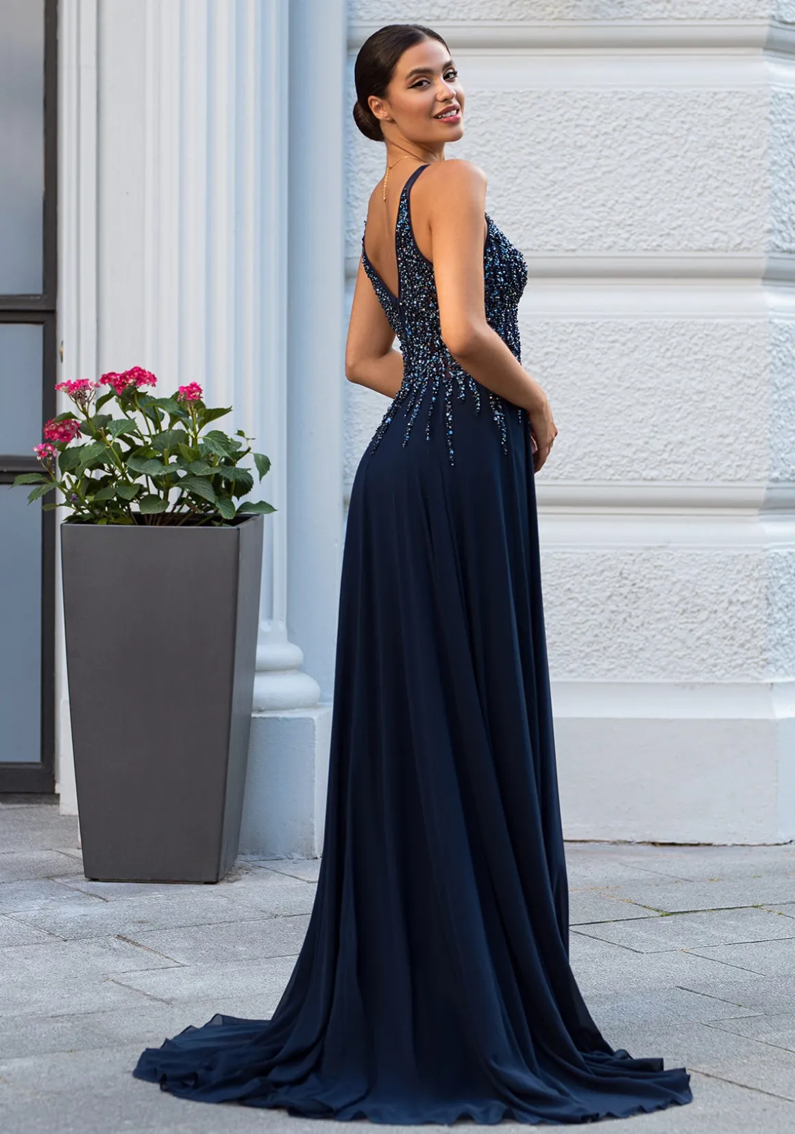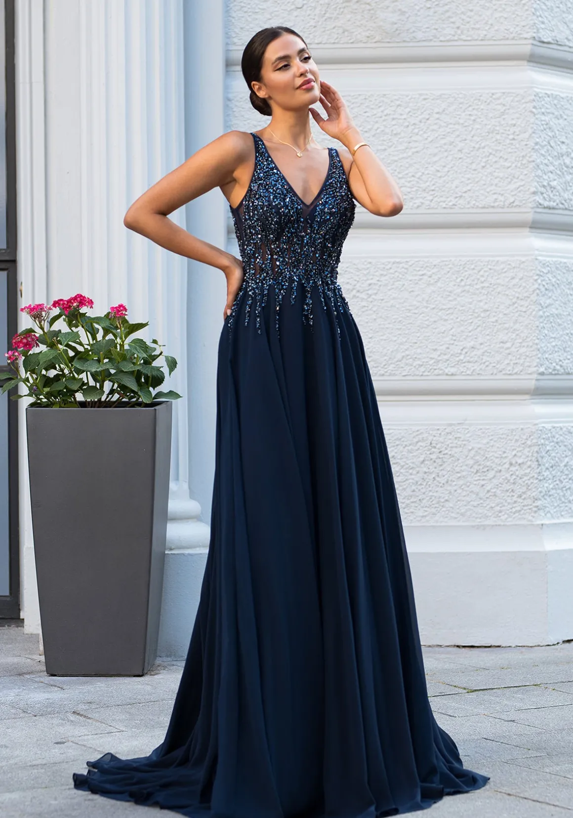 Christian Koehlert 0549 gallakjole i chiffon og v-udskæring. Der er masser af sten øverst, der giver kjolen et smukt design. Den har semi åben ryg.