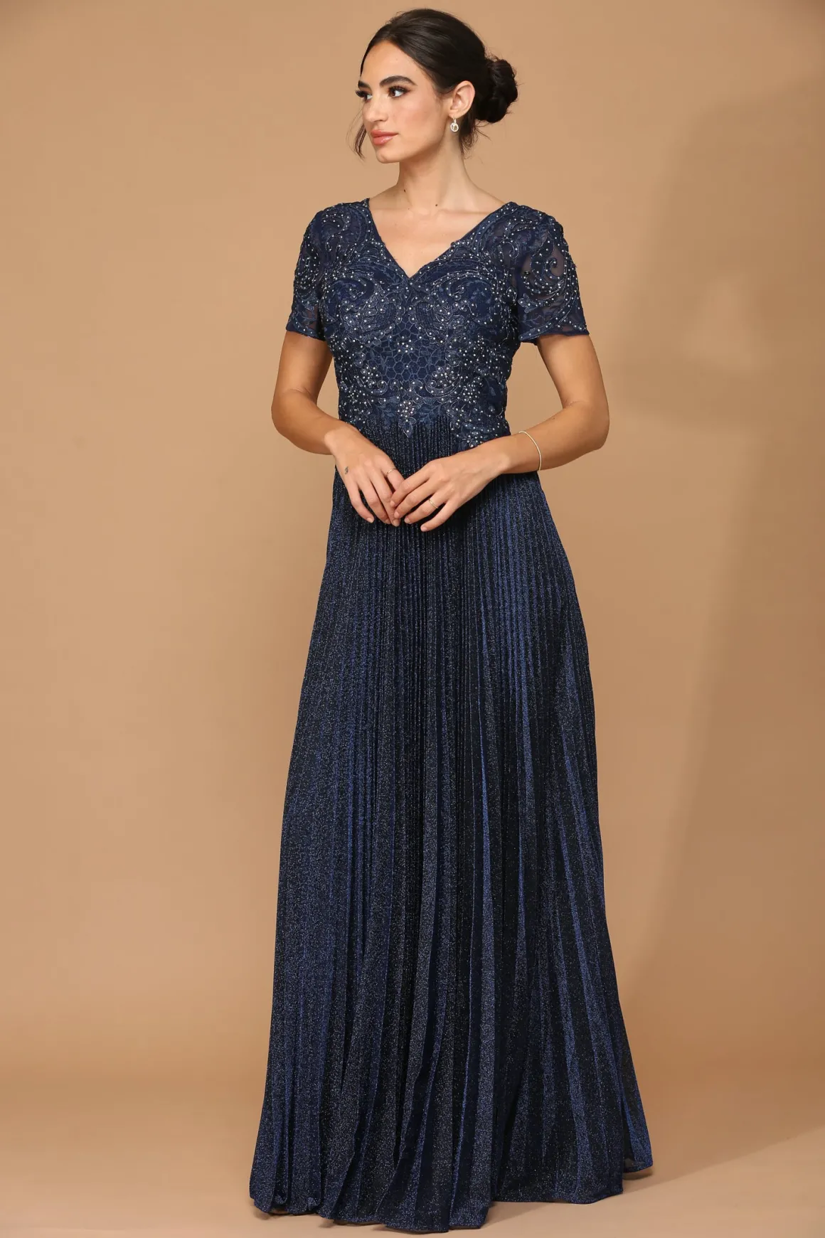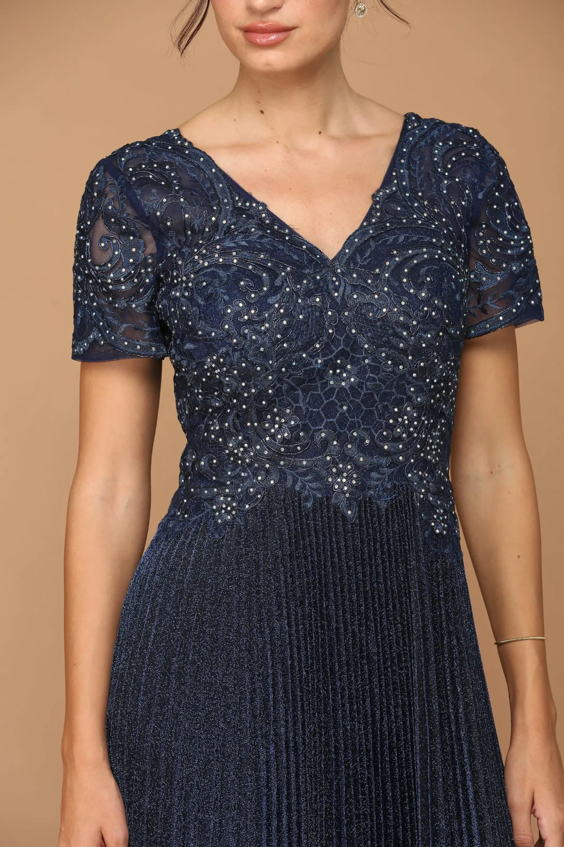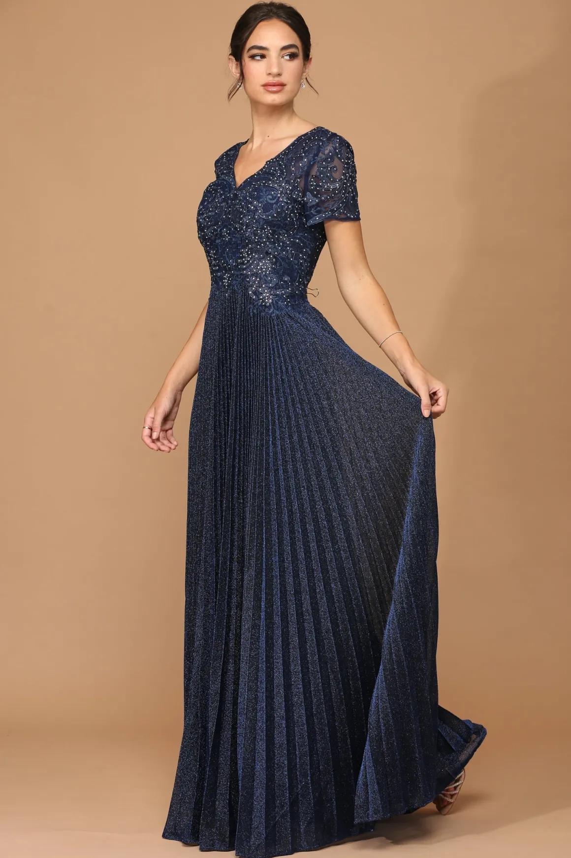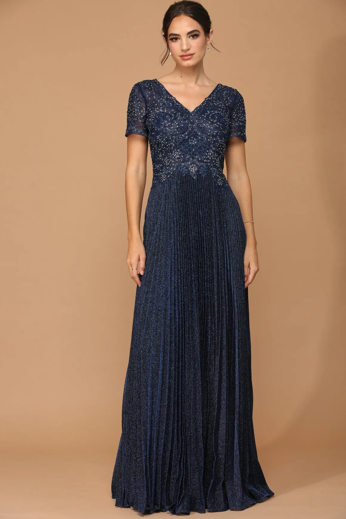 • Festkjole 5241• Lang festkjole med korte ærmer og metallisk shine• Farve : Navy• Størrelse S-5X Navy festkjole med et metallisk udtryk og smukt plisseret skørtBrystmål :Du måler din brystvidde ved at måle det sted om barmen hvor du fylder mest. Taljemål :Du måler taljevidden ved at anbringe målebåndet på det smallest