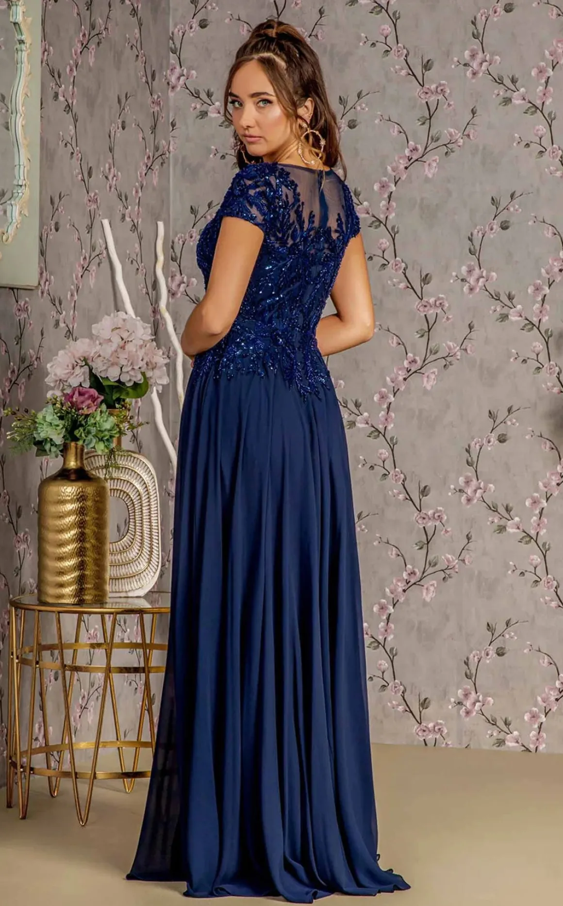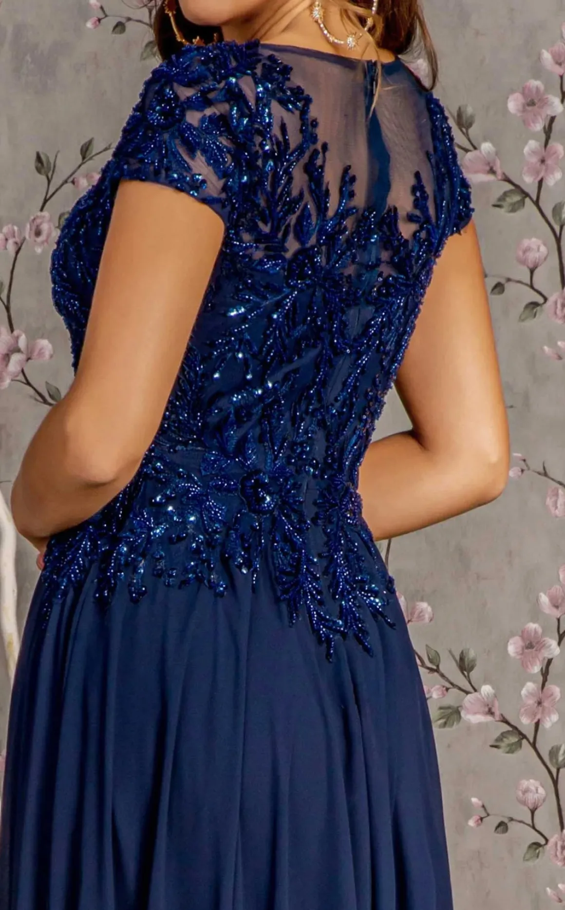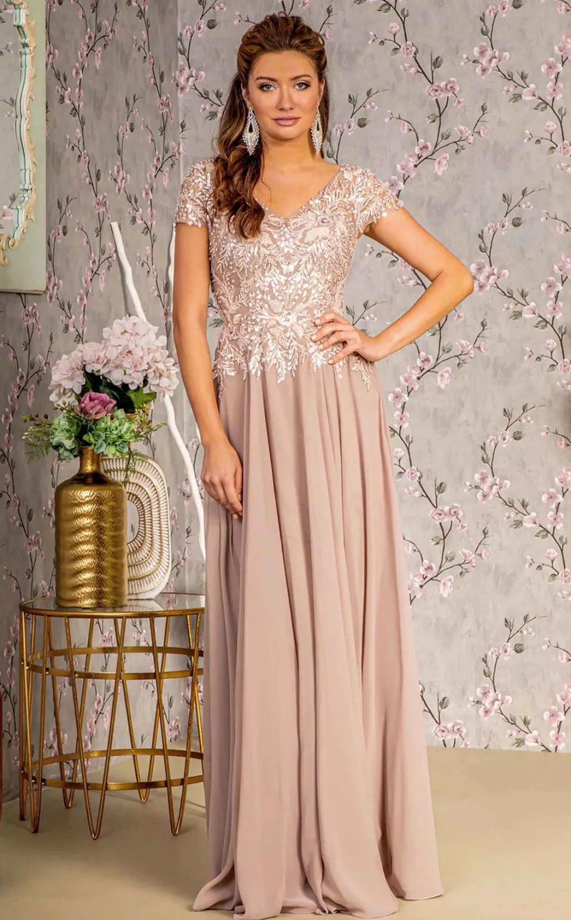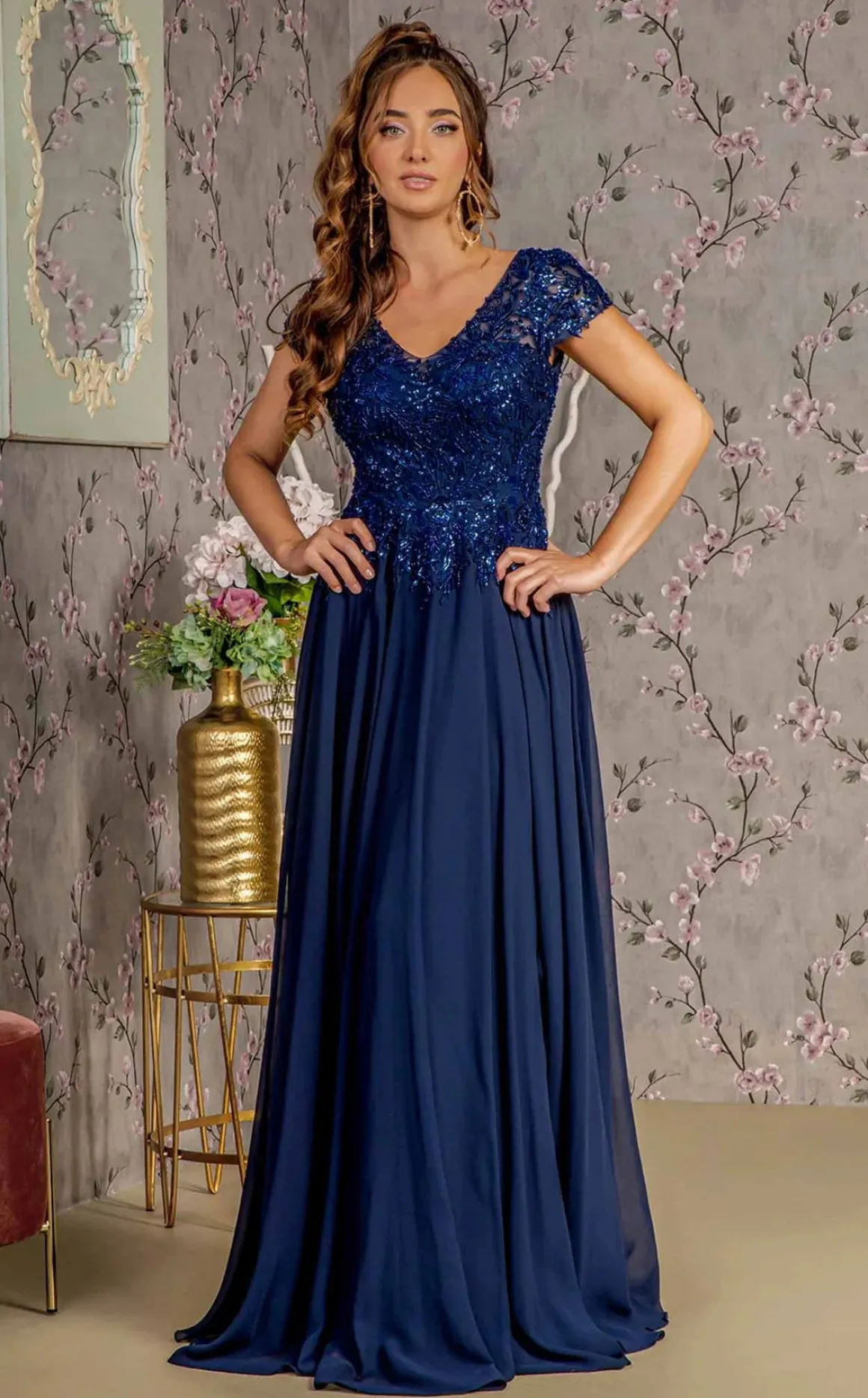 • Elizabeth K 3450 • Lang festkjole med et lille kort ærme • V udskæring – toppen er med perler • Farve : Champagne, navy og grå • Størrelse S-4X Målene er bryst og taljemål Mål dig rundt om barmen hvor du fylder mest og vælg din str. ud fra det mål Taljen måler du rundt om ved navlen Det vigtigste mål er brystmålet
