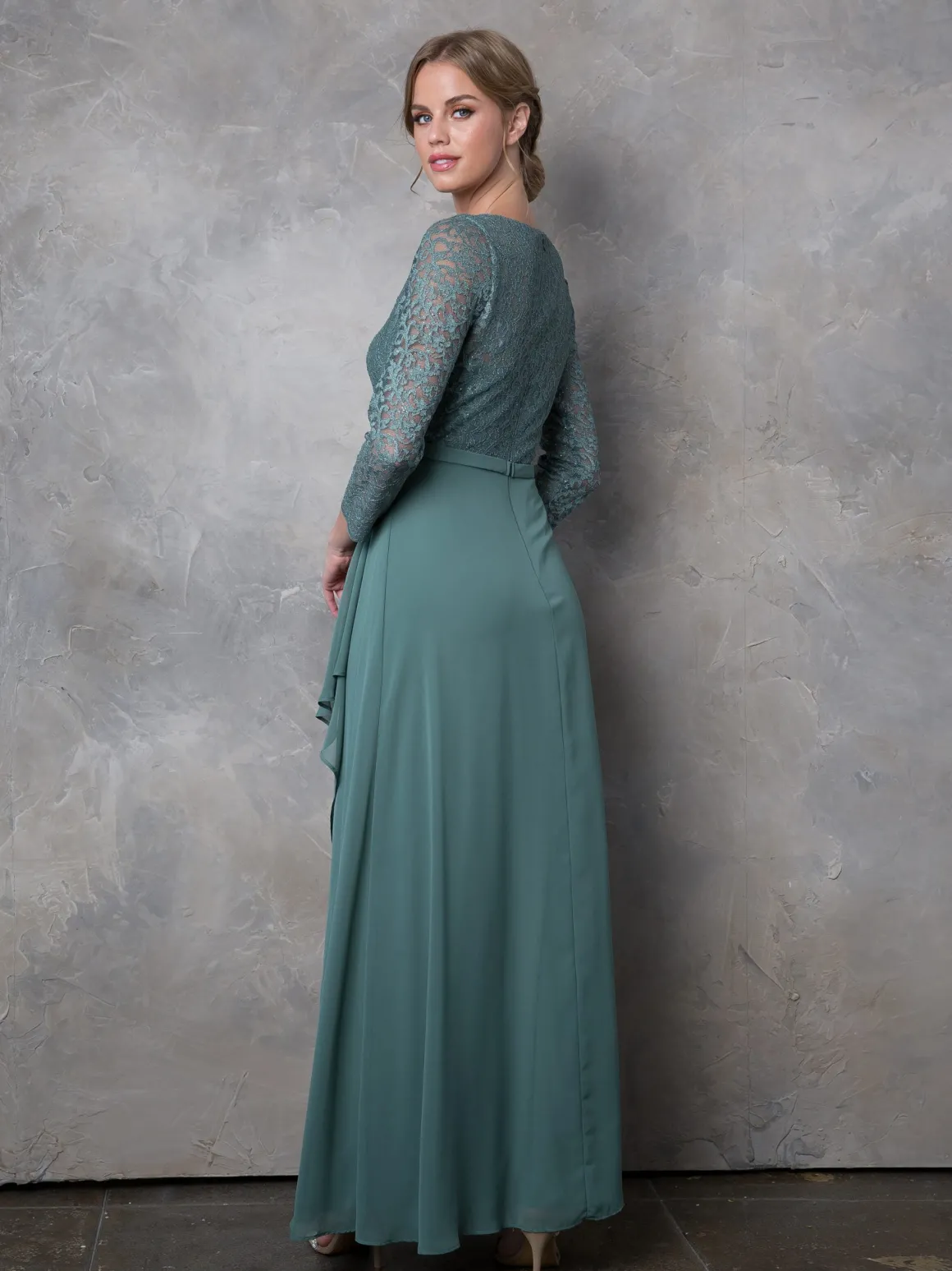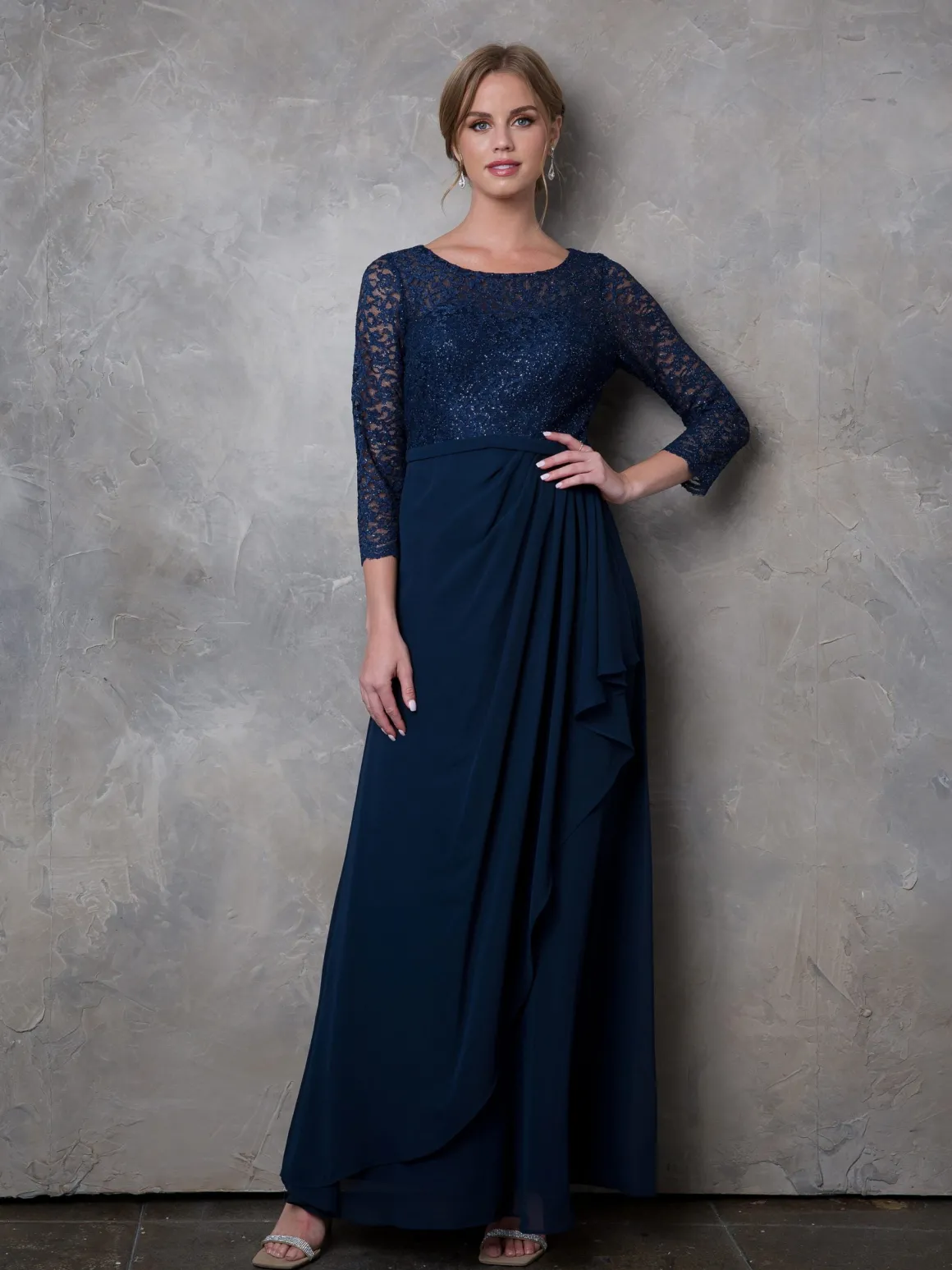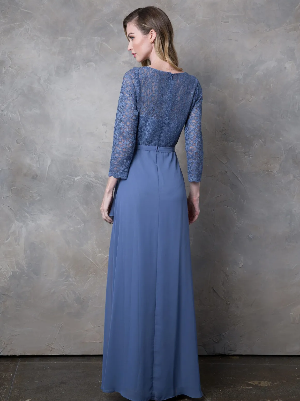 • Eva 3446 • Selskabskjole med blondeoverdel og lange ærmer • Størrelse : S-5X • Farve : Navy, grøn, støvet blå, mauve, mocha, vinrød Målene er bryst og talje Find din kjole størrelse ved at måle dig rundt om barmen hvor du fylder mest og vælg din størrelse ud fra dette mål S Bryst 91 Talje 74 M Bryst 96 Talje 79