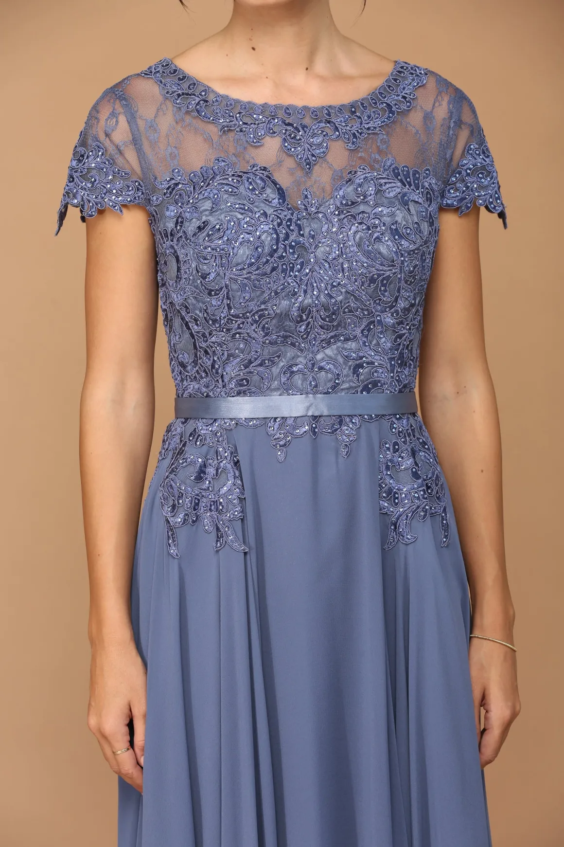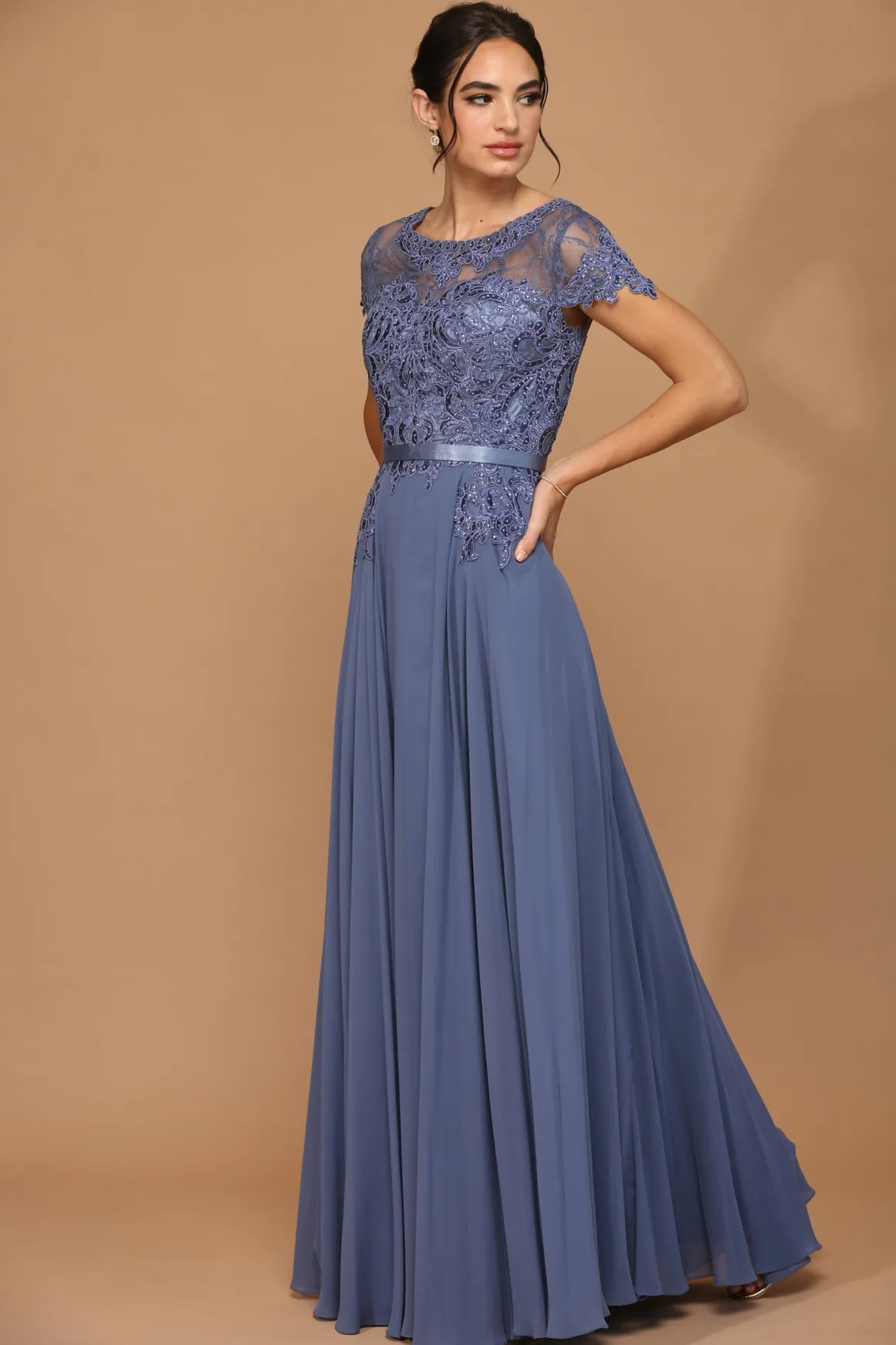 Støvet blå lang festkjole med korte ærmer 5130