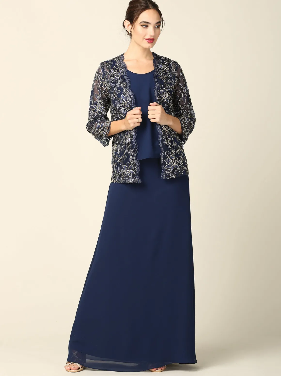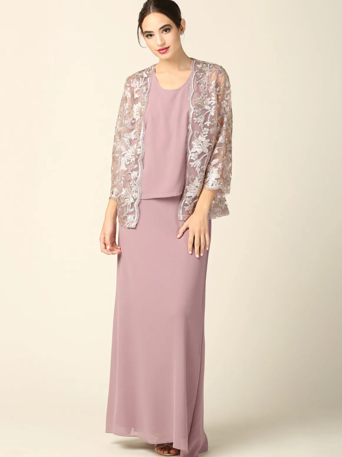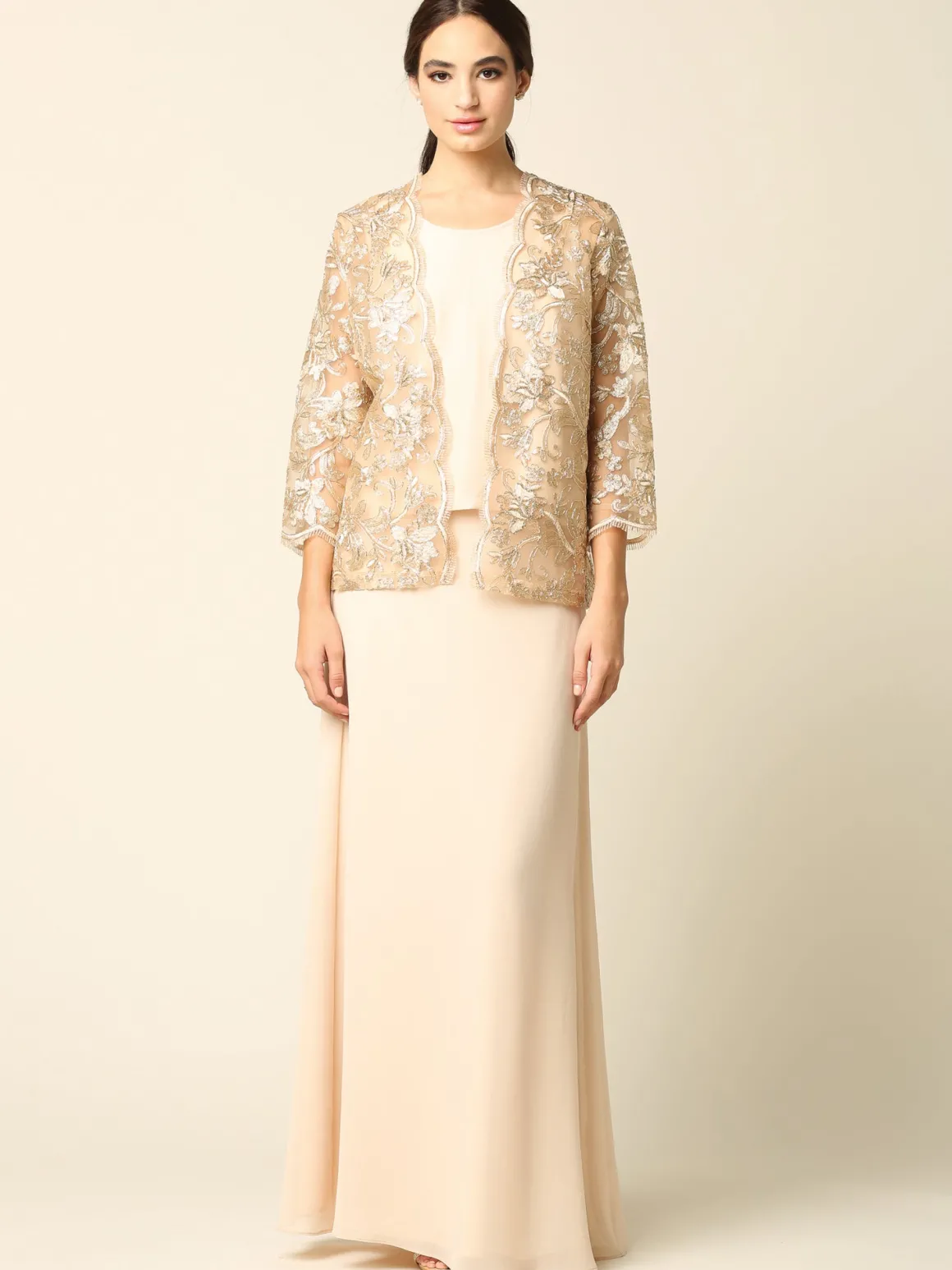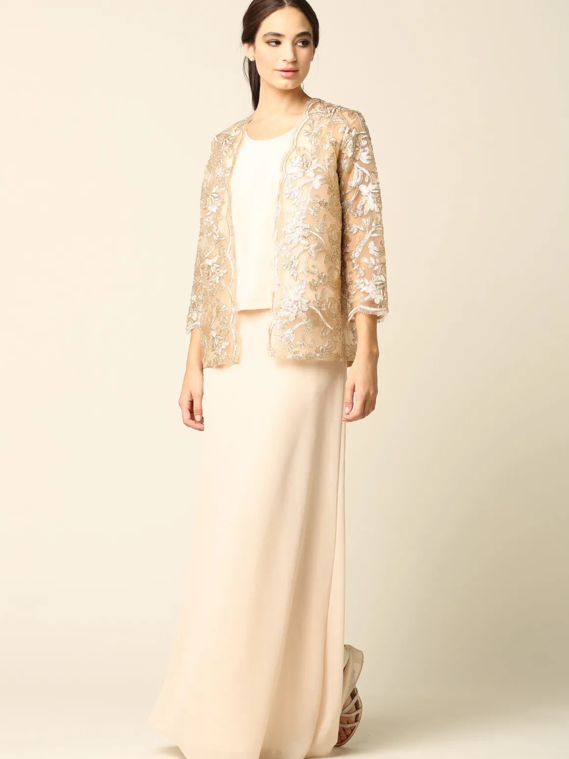3 delt selskabskjole med nederdel, top og blondejakke. Perfekt til bryllup som gæst eller som sølvbryllupskjole.