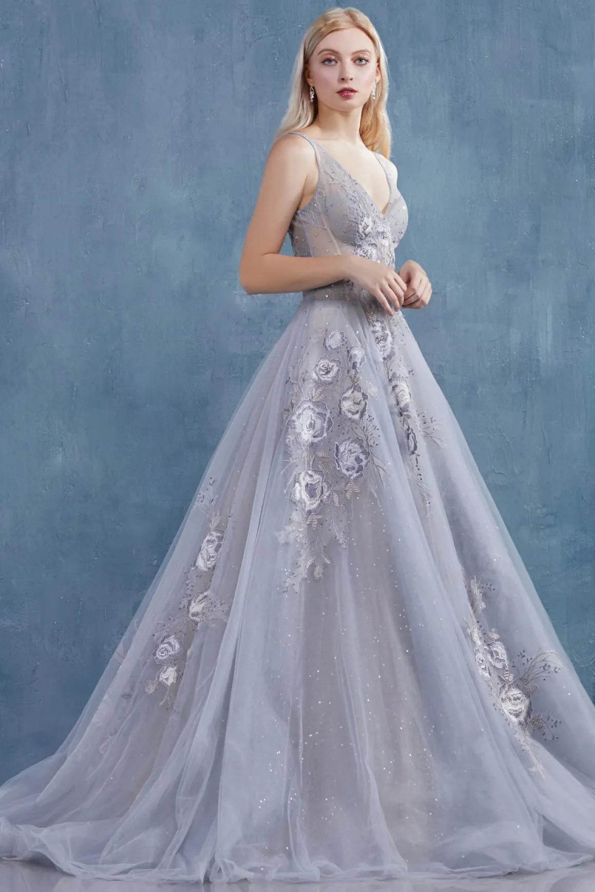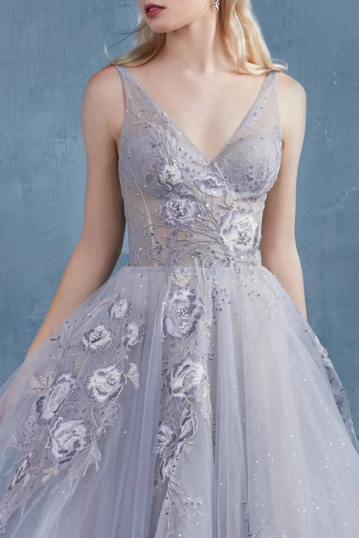 Super smuk gallakjole i farven paris-blue. Kjolen er let transparent øverst, men ikke ved brystet, hvor den er foret. Kjolen har de fineste rose broderinger og glitter i stoffet. Størrelsesguide Mål dig rundt om barmen hvor du fylder mest og vælg din størrelse ud fra det mål. Bemærk taljemålet er mere tolerant og behøv