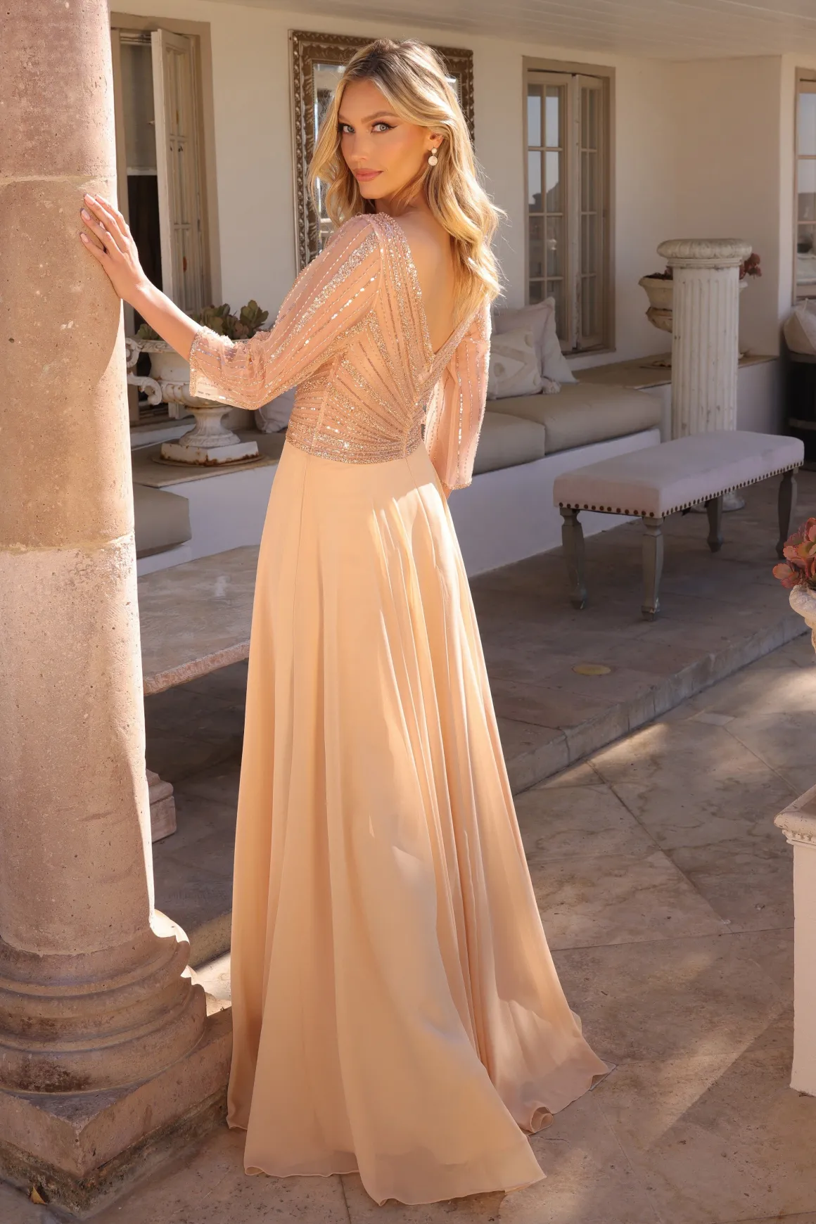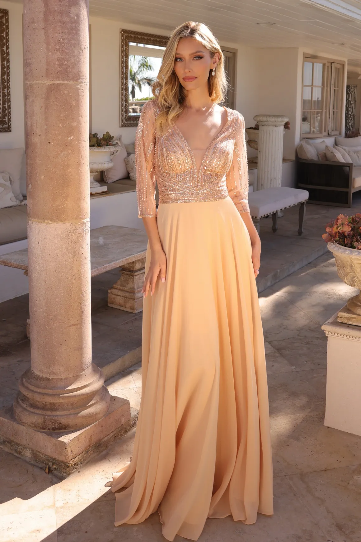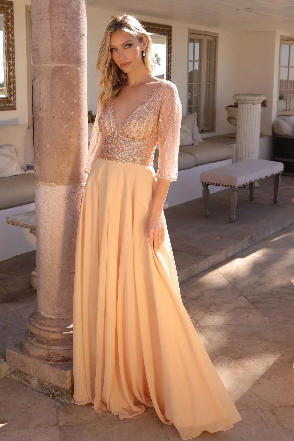 Elegant lang guld festkjole med ærmer og pailletter.