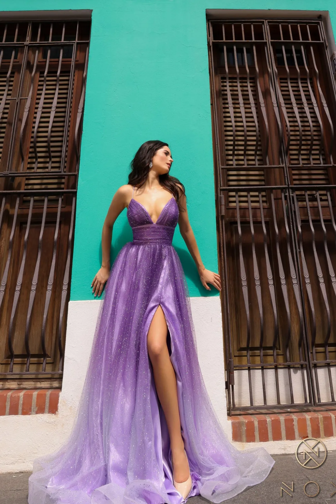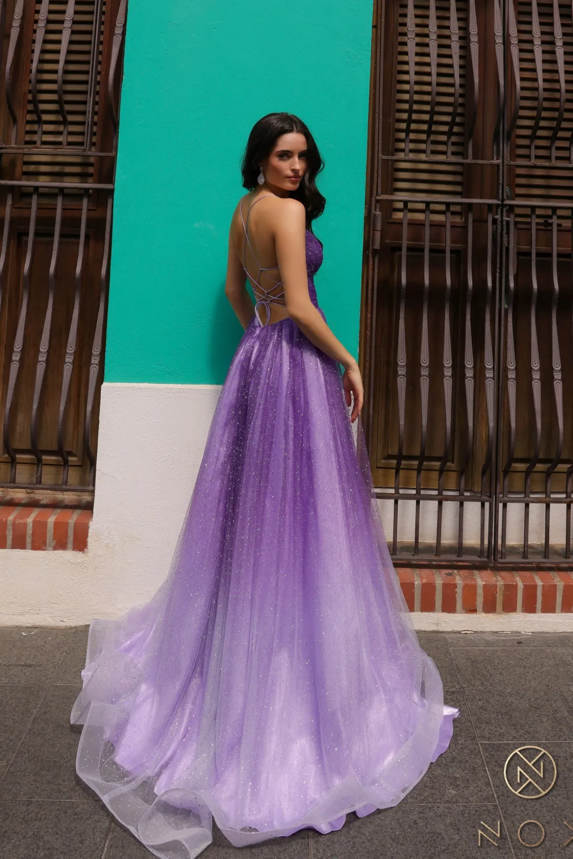 • A-line ombre lilla glitter gallakjole med åben ryg